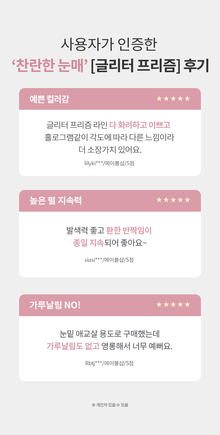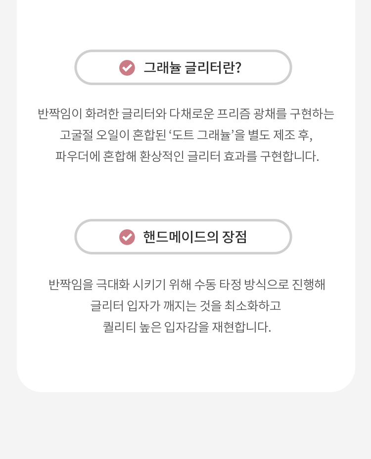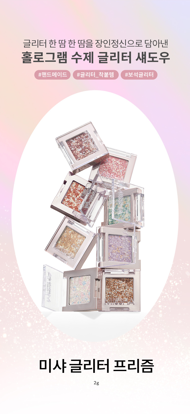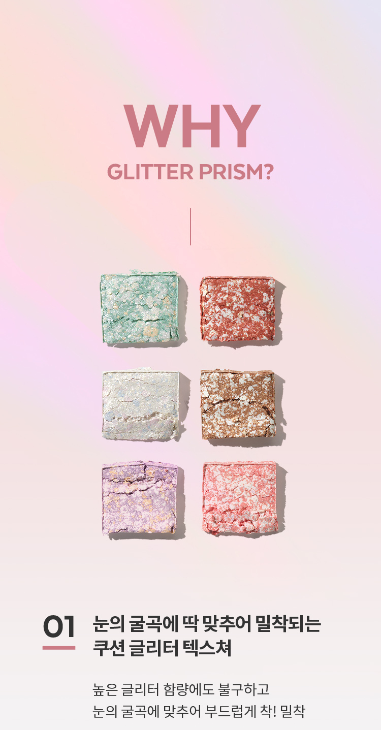 This delicately designed, handmade glitter eyeshadow provides high-shine, holographic finish. Cushion Glitter Texture smoothly lays on any curved eye area despite supercharged sparkle. Jewel-like granule glitter is delicately crafted by handmade processing for a striking glitter effect.