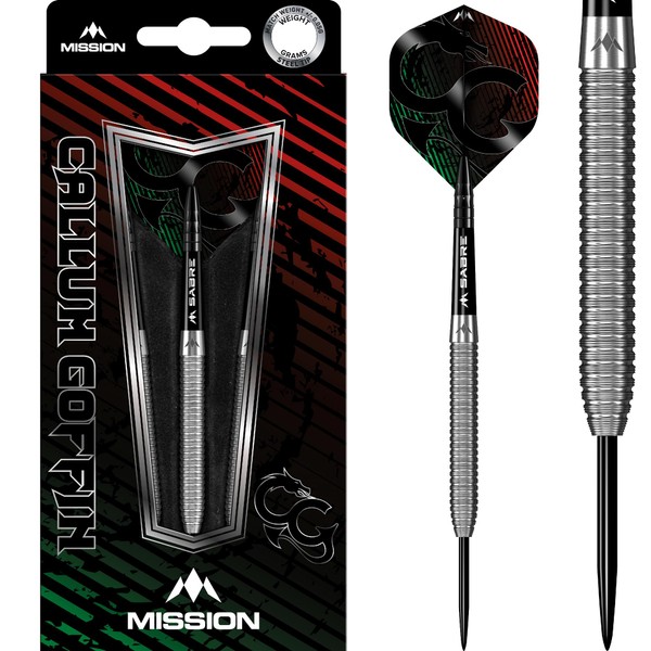 • Mission Callum Goffin Steel Tip Tungsten Darts - 90% Tungsten - Micro Grip Features: 90% Tungsten Barrels, 1 Set Mission Flights, 1 Set Mission Shafts.