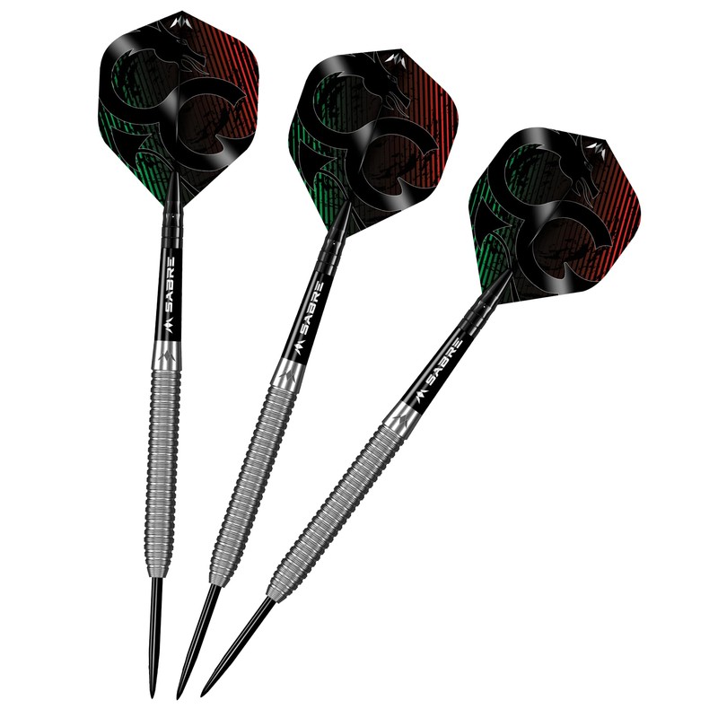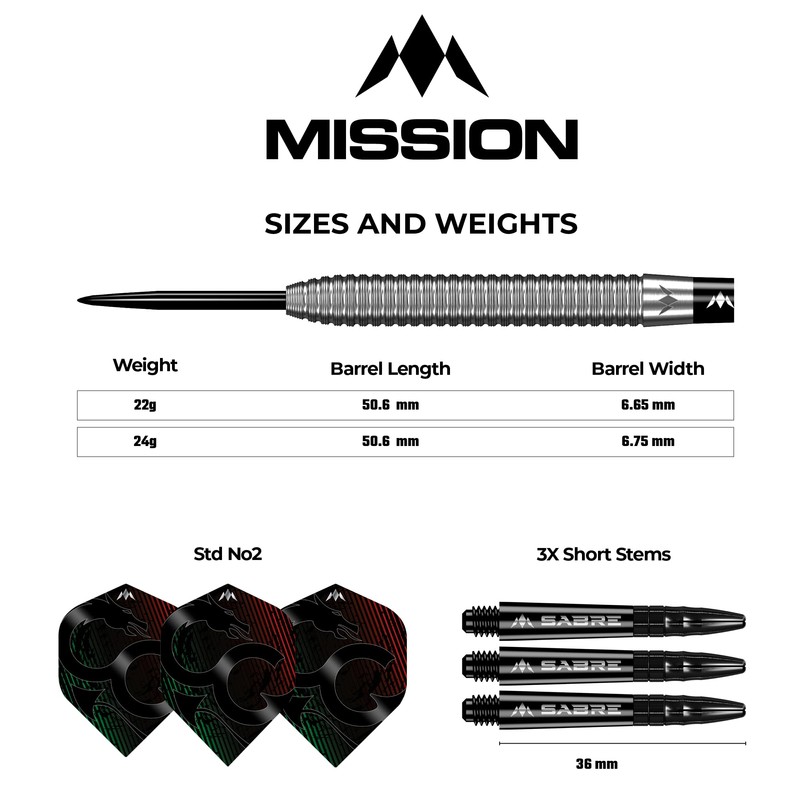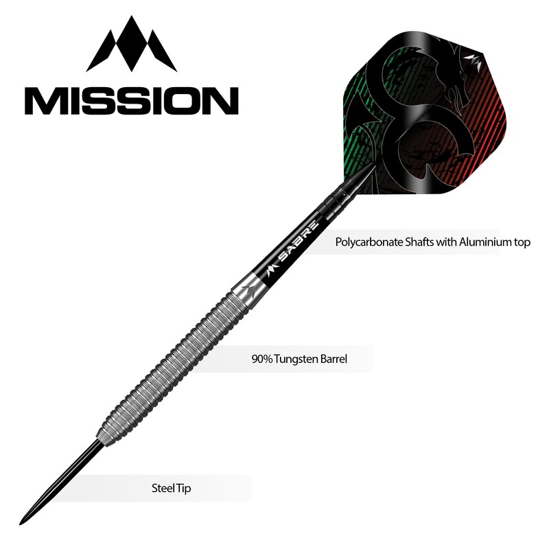 • The barrel leads to a black Mission Sabre shaft that grips the flight firmly. The dart is complete with a black dot and the Mission logo is lasered into the back of the shaft