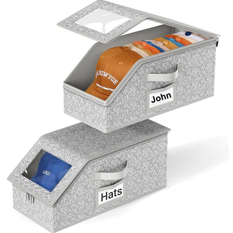 • 【Multiple Uses】: This stackable hat storage box offers versatile organisation for more than just headwear. It's equally practical for storing clothing, bedding, books, toys, scarves and other miscellaneous items. Featuring a convenient name card window for easy identification, the hat case can be neatly placed in your bedroom, living room, wardrobe or even your car boot