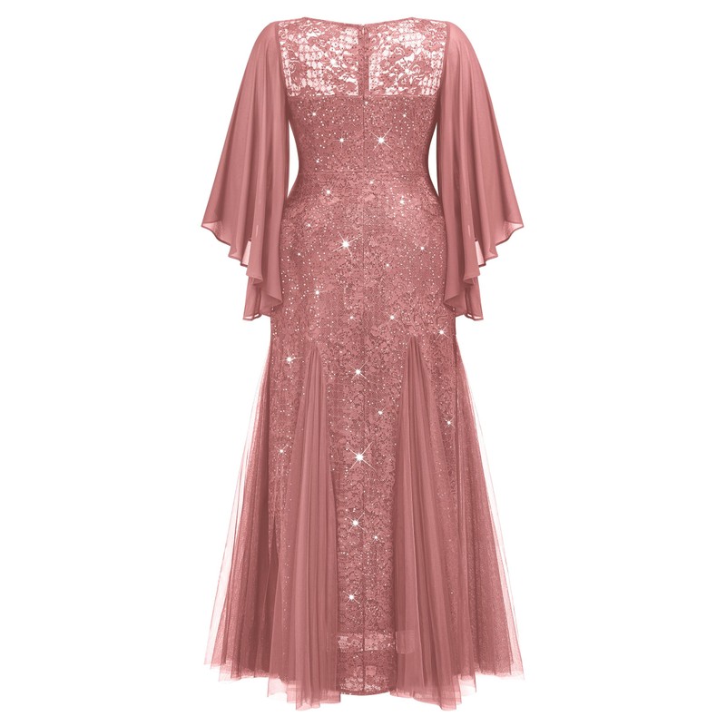 - Features: Attractive Sequin Lace Design,Scoop Neck, Femine Tulle Mermaid Hemline, Flowy Flutter Sleeves, Empire Waist,Zipper up Back,Slim Fitting,Floor Length Maxi Dress