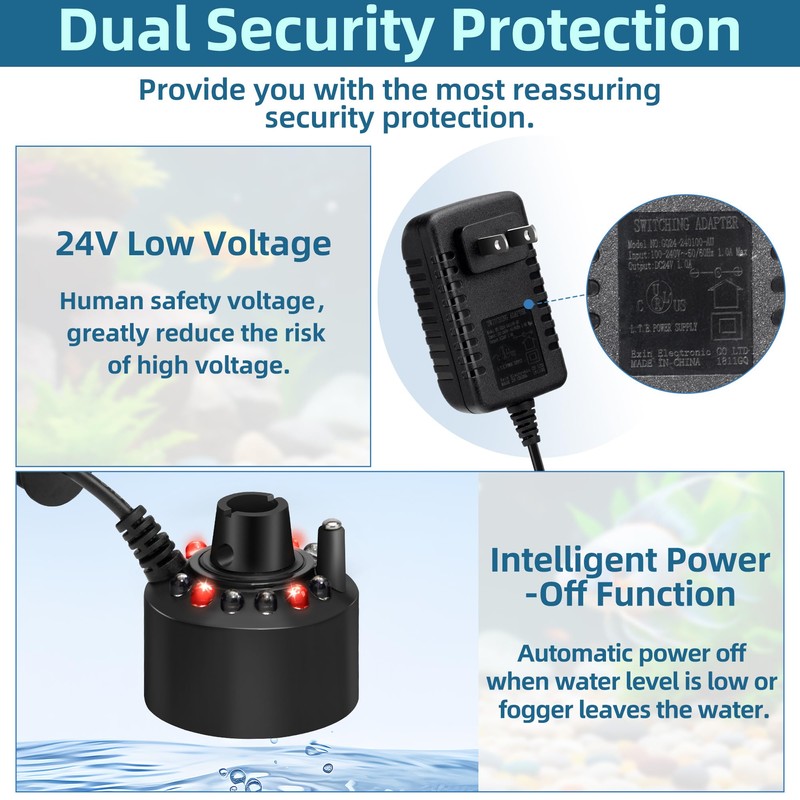 - 【Dual Security Protection】: The 24V low voltage design of DaToo Ultrasonic Fogger can fundamentally ensure the safety of users during operation and greatly reduce the risks that may be triggered by high voltage. In addition, it is equipped with an advanced smart power-off function that automatically stops the fog machine once it encounters insufficient water or the device is detached from the water surface during use, further enhancing the peace of mind and reliability of use.