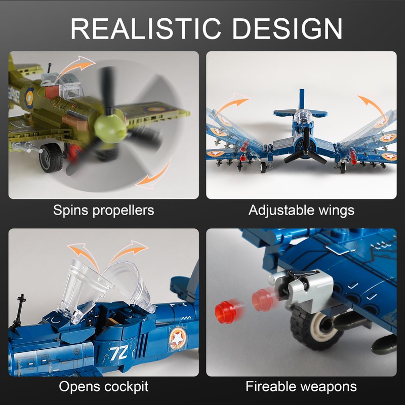 - Two WW2 Military Plane Models: The American F4U fighter jet and UK spitfire fighter plane toy allows kids to bring their imagination into the historical WW2 aerial combat scenarios. opens cockpit door, spins propellers , glides wheels, the wings of the F4U fighter airplane can be folded up or down, adding to the excitement of playtime