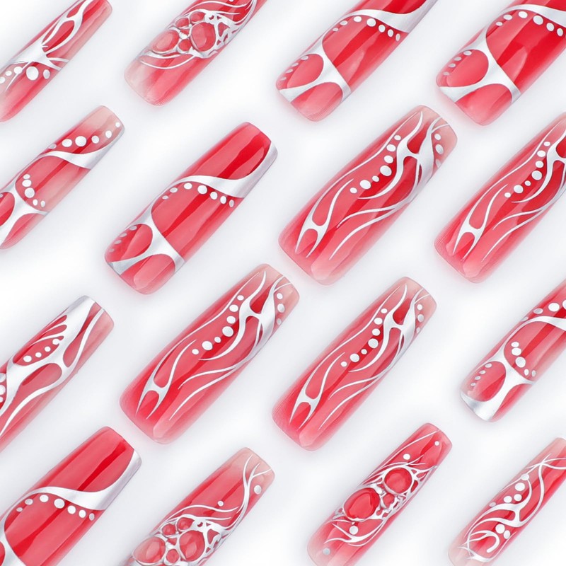 - 【Unique Design】 According to the most popular elements of the moment, these extra long square press on nails are designed with red ombre and 3d silver chrome swirl.