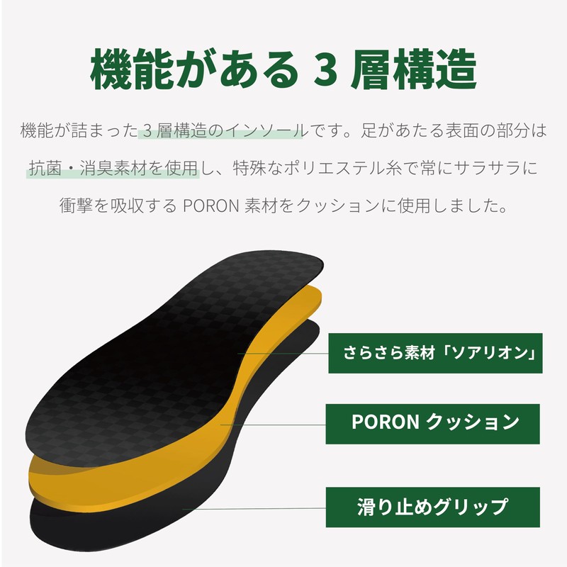 • Uses Poron a special material with excellent body pressure dispersion and shock absorption, and gently deforming according to the shape of the foot