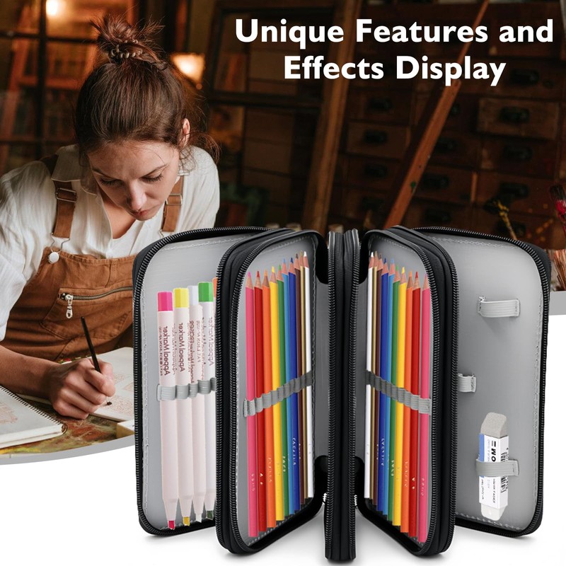 • Large capacity pencil case: 4-layer design with 72 insertion holes inside. Holds up to 72 pencils with extra compartment for eraser and sharpener, each pen has its own individual hole/strap. You won't miss it.