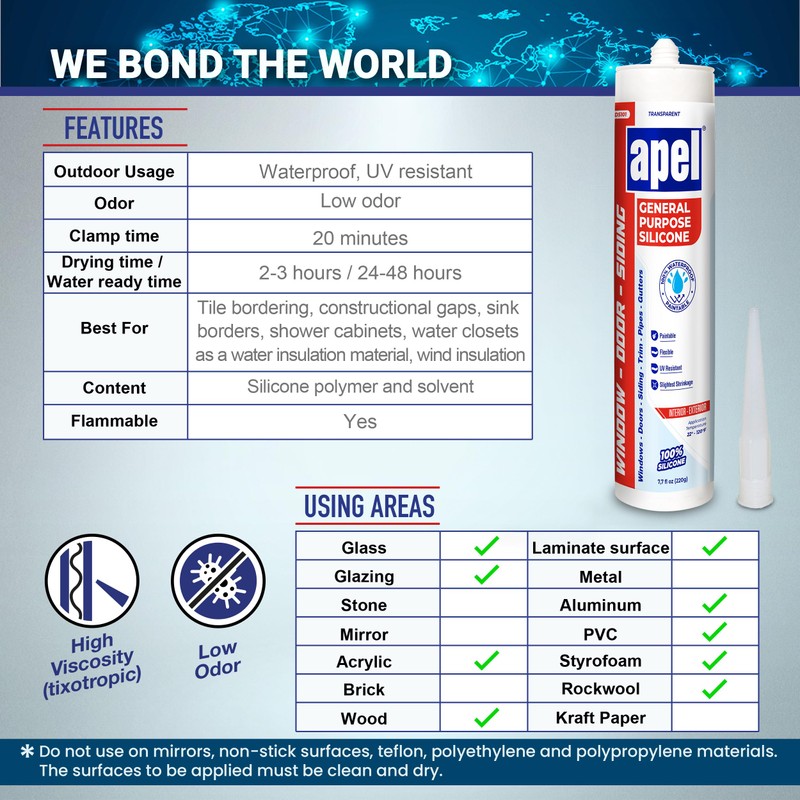 - Low Odor - You won’t have to deal with strong or hazardous chemical smells when using our sealant, as this silicone caulk is low odor. It is 100% silicone polymer and includes solvents and additives.