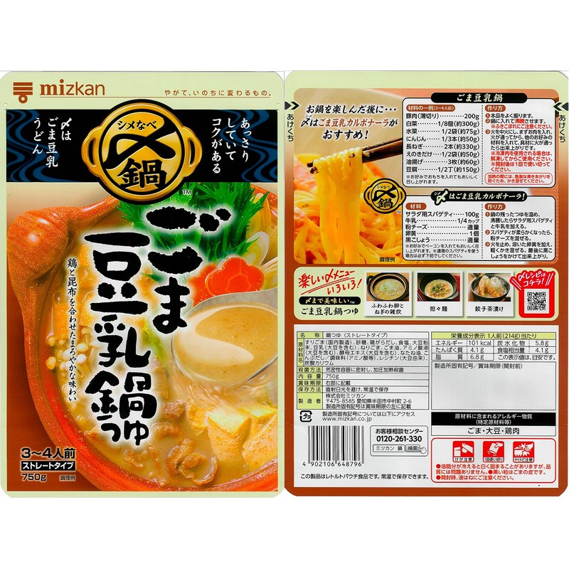 - Ingredients: Soy milk, jesame, sugar, chicken extract, salt, sesame oil, soy powder, amino acid liquid, soy milk powder, miso, kombu, seasoning (amino acids, etc.), lecithin, potassium carbonate