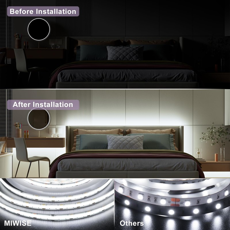 - 2700K-6500K CCT Tunable: Do you want any color temperature between 2700K and 6500K? Do you want warm light as well as bright and comfortable natural white light? Choose MIWISE CCT COB LED strip light, then you can get any color temperature between 2700K to 6500K! No more installing multiple LED strip lights with different color temperatures.