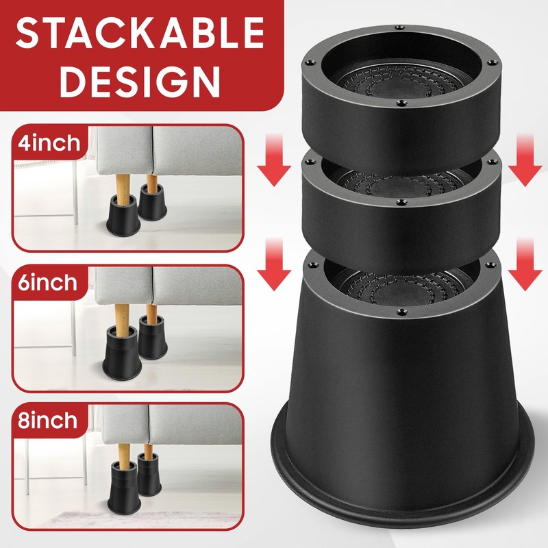 - ✔ STACKABLE 4,6,8 INCH -- Our bed risers can be altered with three height options: 4 inch,6 inch,8 inch, you can stack the bed raisers according to your needs