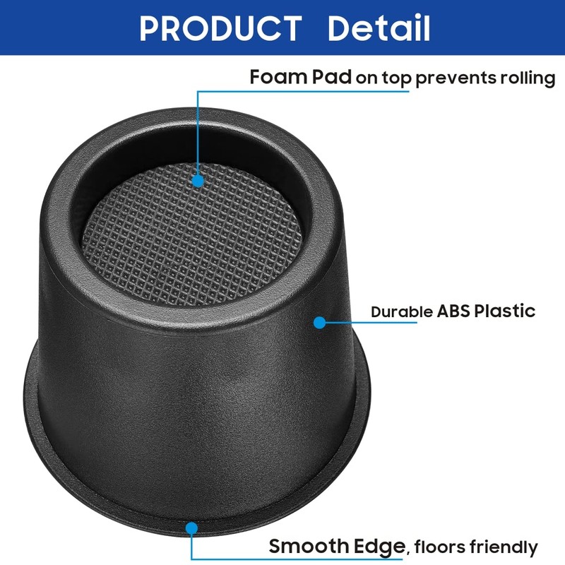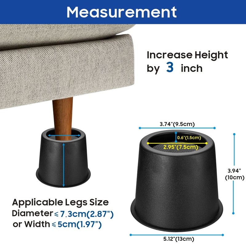 - ✔ PROTECTIVE CUSHION PAD -- Our chair raisers are designed with a memory foam cushion pad built into the top of risers, securely locks in furniture legs and caster wheels Diameter≤7.3cm(2.87") or Width≤5cm(1.97")