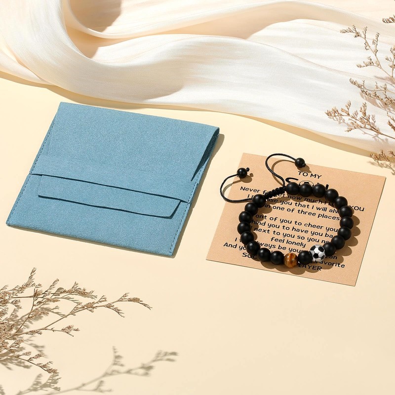 - *To Soccer Son Bracelet Gifts* Simple and meaningful tiger eye black beads bracelet with cute soccer charm and a message card saying "To My Son, Never forget how much I love you. I promise you that I will always be in one of three places: in front of you to cheer you on behind you to have you back and next to you so you never feel lonely. I will always be your NO.1 fan. And you will always be my favorite SOCCER BALL PLAYER".