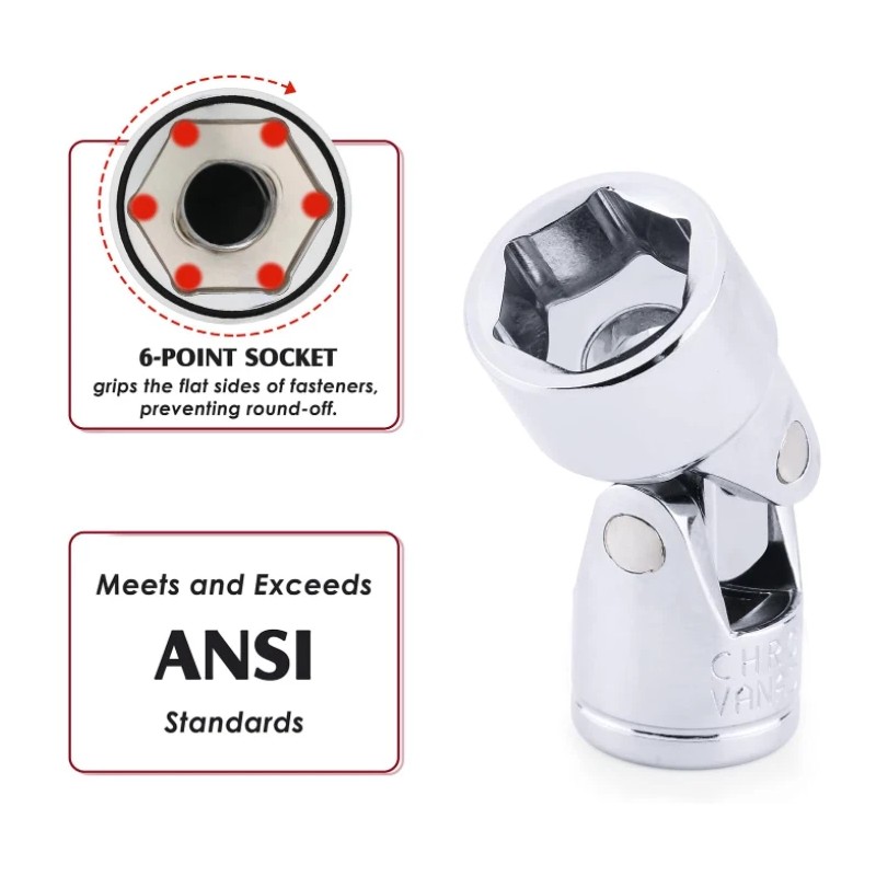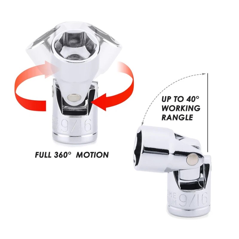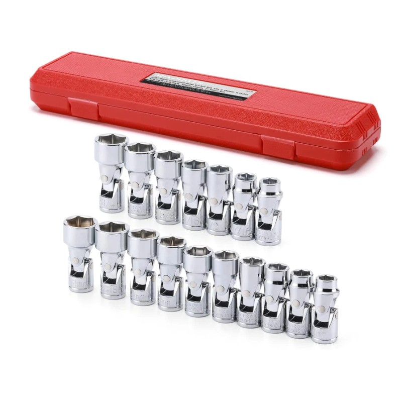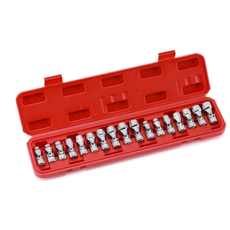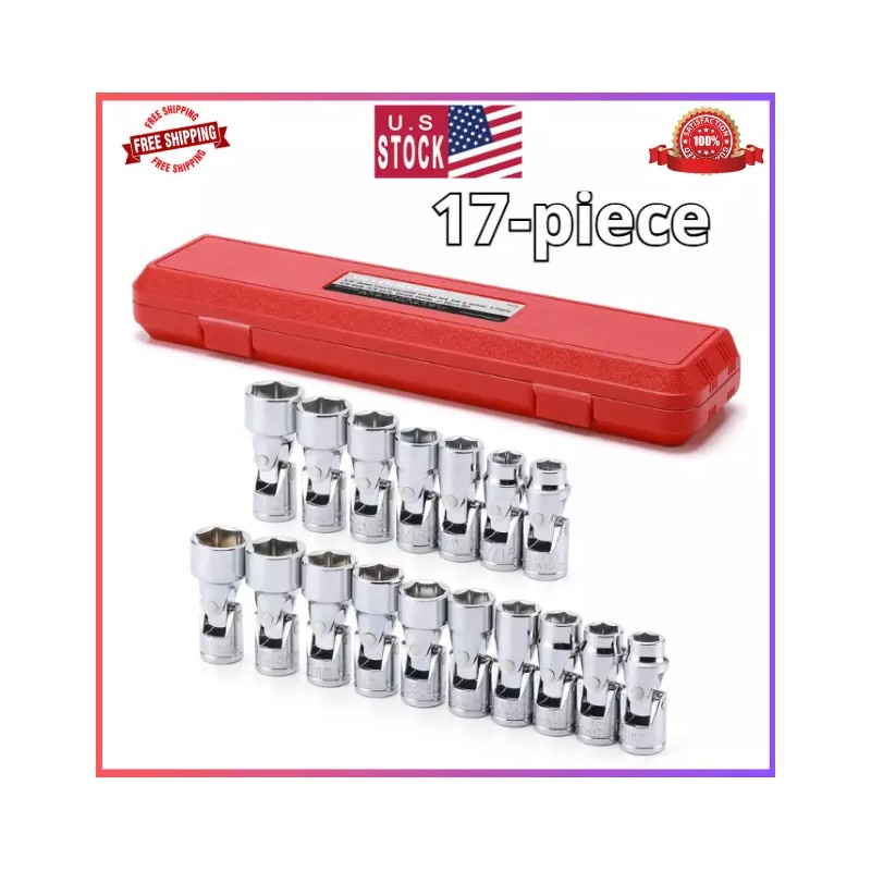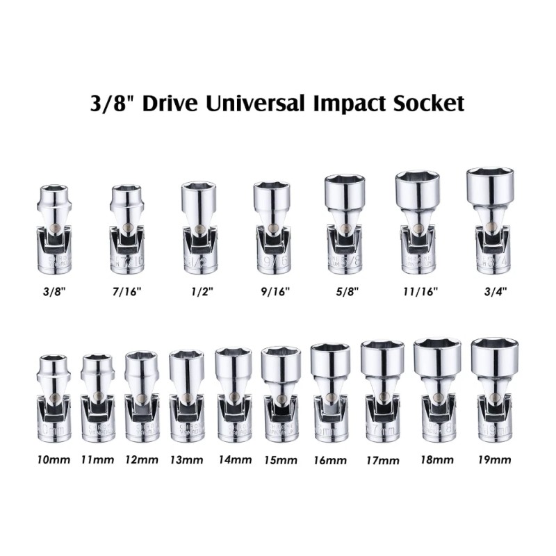 【Set Includes】17-piece 3/8" Drive Universal Joint Socket Set(Metric): 10mm, 11mm, 12mm, 13mm, 14mm, 15mm, 16mm, 17mm, 18mm, 19mm. (SAE ): 3/8", 7/16" 1/2", 9/16", 5/8", 11/16", 3/4".