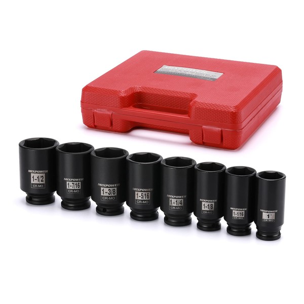 MIXPOWER 8 Pieces 1/2-Inch Drive Deep Impact Socket Set, CR-MO, 6 Point, Deep, SAE, 1-Inch - 1-1/2 inch, 1/2" Drive Axle Nut Socket Set