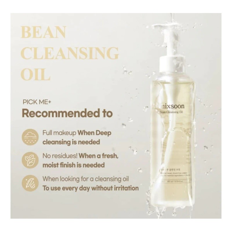 💧 Limpieza profunda, suave y nutritiva desde el primer paso. El Mixsoon Bean Cleansing Oil 195ml es un aceite limpiador coreano que elimina eficazmente maquillaje, protector solar, exceso de grasa e impurezas sin resecar ni irritar la piel. 🌿✨