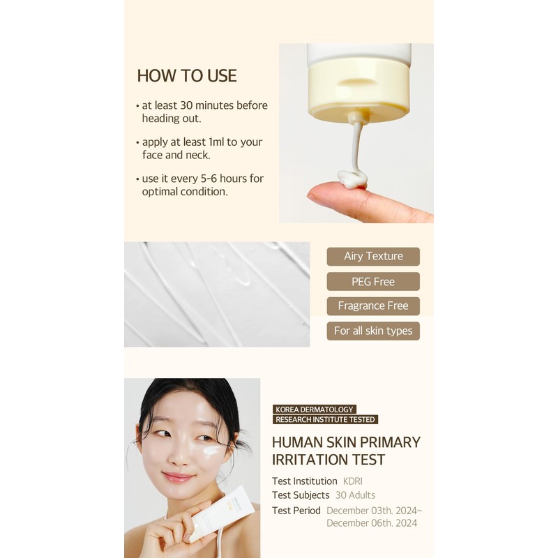 ✅ Gentle & Skin-Friendly Ingredients – Infused with natural wheat sprout extract and fermented bean, this sunscreen is suitable for all skin types and has passed skin irritation tests.