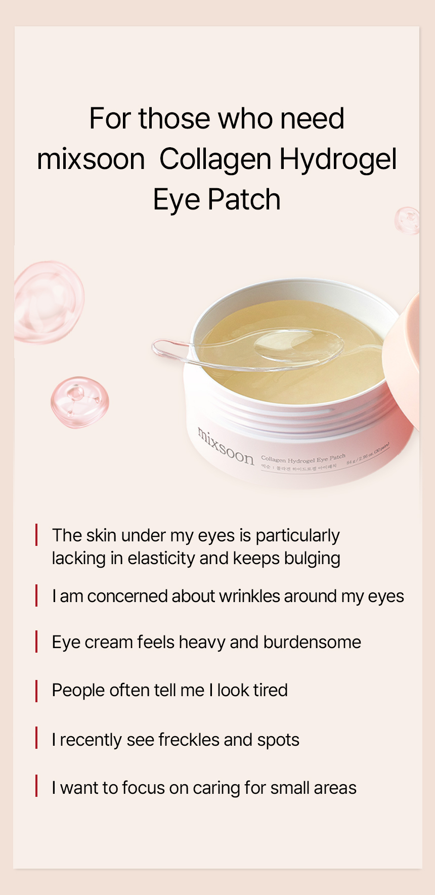 For the delicate eye area, use for just 30 minutes a day. An easy and convenient product that cares for the eye area to be moist and radiant. Suitable for those who feel the skin under the eyes lacks elasticity and keeps sagging, are concerned about eye wrinkles, find eye creams burdensome, often hear they look tired, notice spots or blemishes, or want to focus on small areas. A functional product for wrinkle improvement and skin brightening approved by the MFDS. The hydrogel, which contains densely packed active ingredients, is absorbed as soon as it touches the skin.