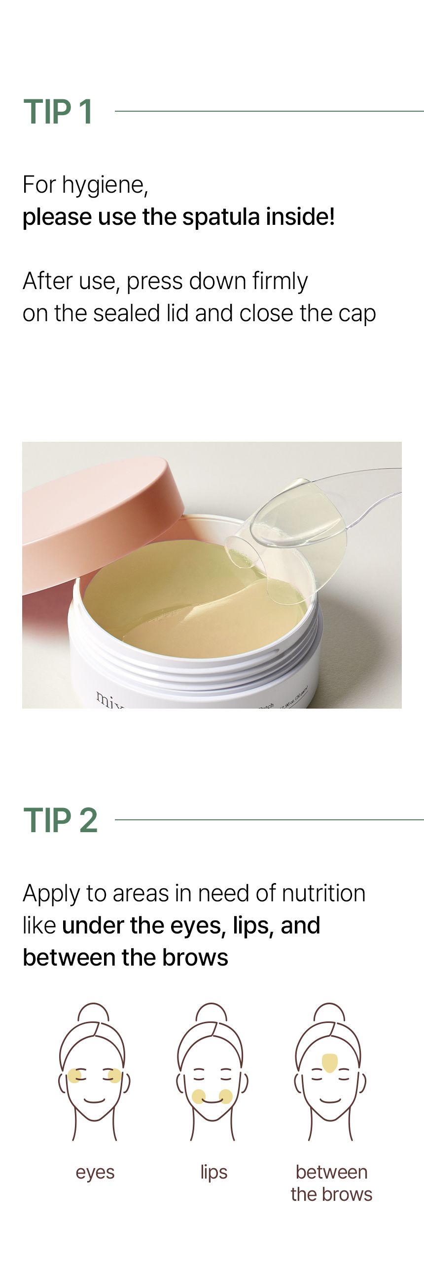 After cleansing, soothe the skin. Use a spatula to take out the eye patch and apply it to the eye area or any area that needs nourishment. Wait for 20-30 minutes. After removing the eye patch, lightly tap the remaining essence to absorb.