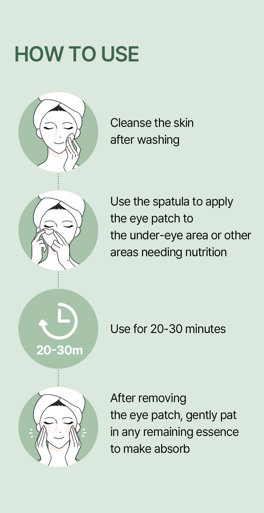 - How to Use: 1. After cleansing, apply the eye patch to the eye area and areas that need nourishment. 2. Remove the patch after 20-30 minutes and gently pat the remaining essence into the skin.