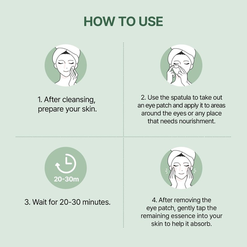 • HOW TO USE : 1. After washing your face, put eye patches around the eyes and areas that need nutrition. 2.After 20 to 30 minutes, remove it and gently pat the remaining essence on the skin as if massaging.