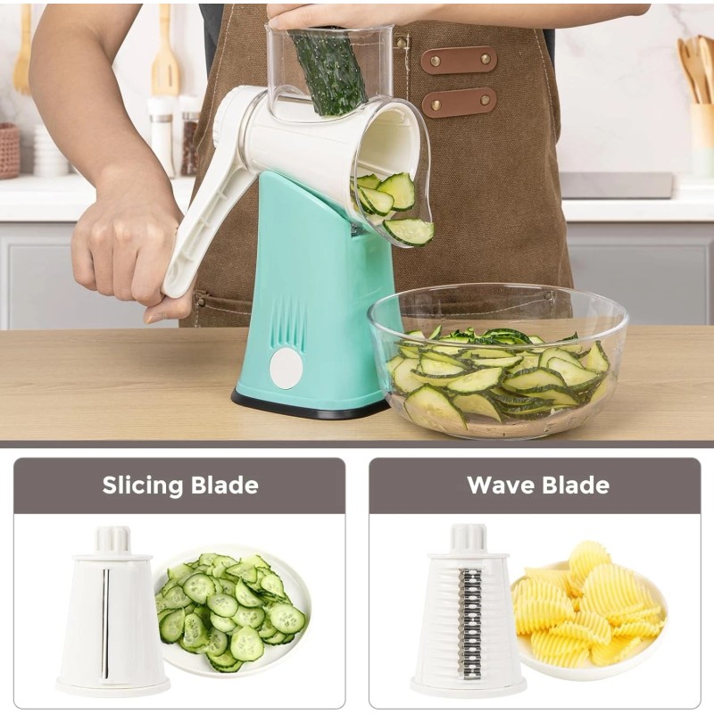 • Versatile Kitchen Appliances: The cheese grater hand crank is a multifunctional kitchen chopper and slicer, equipped with three interchangeable blades for slicing, shredding, and coarse grinding. This versatile cheese grater is perfect for grating cheese, vegetables, cookies, nuts, chocolate, and more, effortlessly handling your culinary tasks