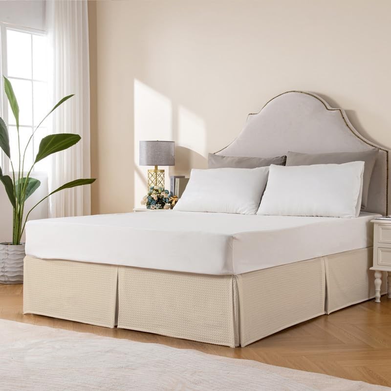 MIYE Pleated Waffle Weave Bed Skirt, Tailored Dust Ruffle 18 Inch Drop Easy Fit, Machine Washable (Cream, Queen - 18" Drop)