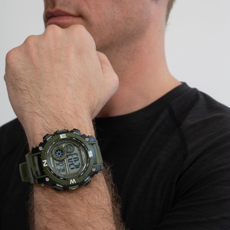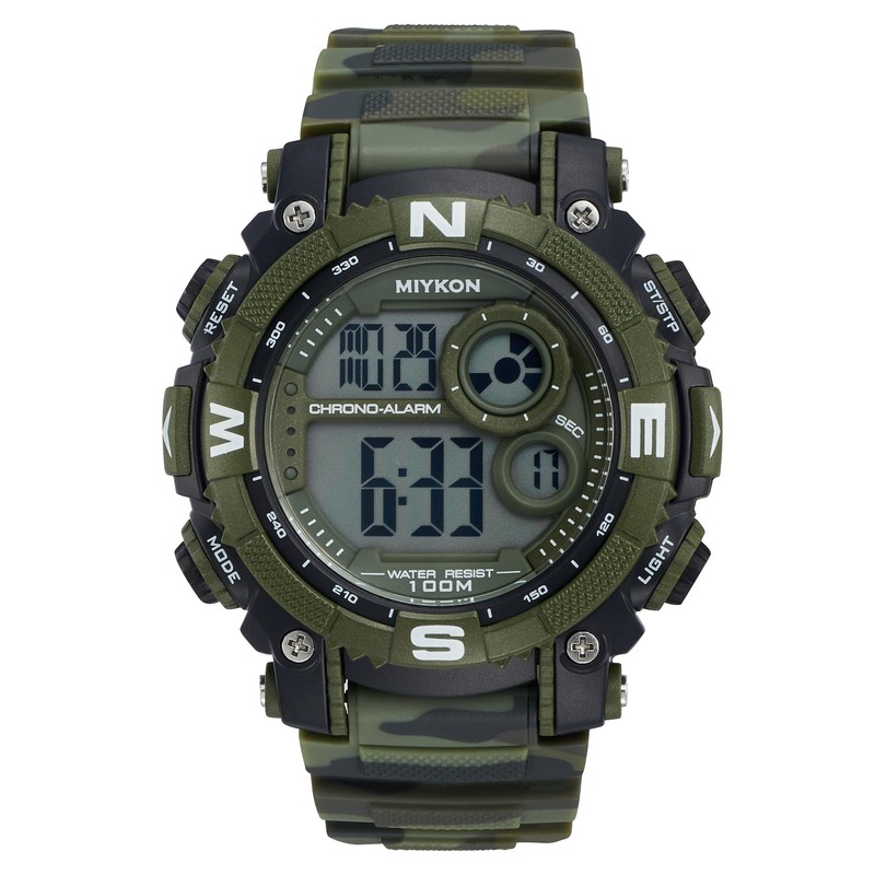 Miykon Model A3A40 offers a versatile array of functions, including a chronograph stopwatch, daily alarm, lap timer, and dual timezone tracking. Toggle between 12/24-hour military time formats and keep track of dates with the auto calendar feature. This watch combines enhanced visibility with rugged durability, featuring a backlit display and 100M water resistance, making it suitable for both everyday wear and outdoor adventures. The camo pattern makes the Model A3A40 both functional and stylish for outdoor enthusiasts.