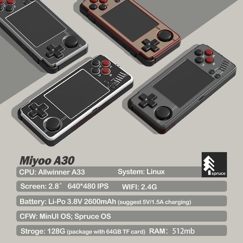 - Stunning Visuals: The Miyoo A30 boasts a high-definition 2.8-inch IPS display, delivering crisp and vibrant visuals with a full viewing angle. With OCA fully fit technology and a resolution of 640*480, Powered by the A33 processor, enjoy smooth operation and seamless gameplay.