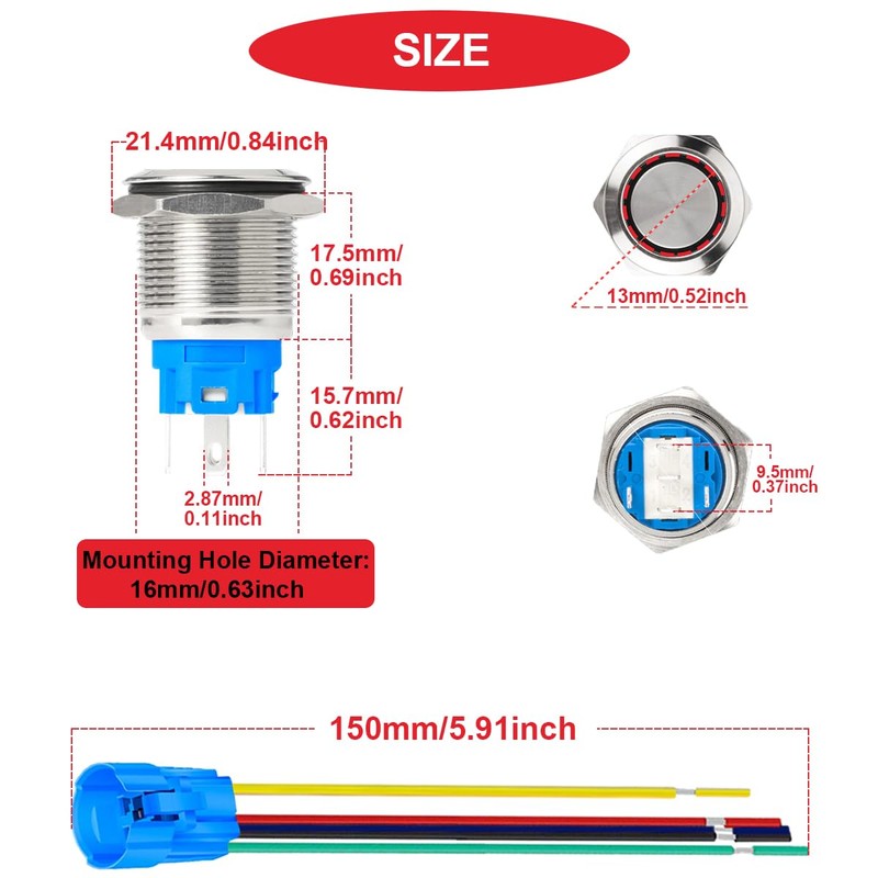 - Easy to install: the size of the mounting hole is 16 mm/0.63 inches. Insert the switch into the hole and connect the cable. LED Voltage: only 12V
