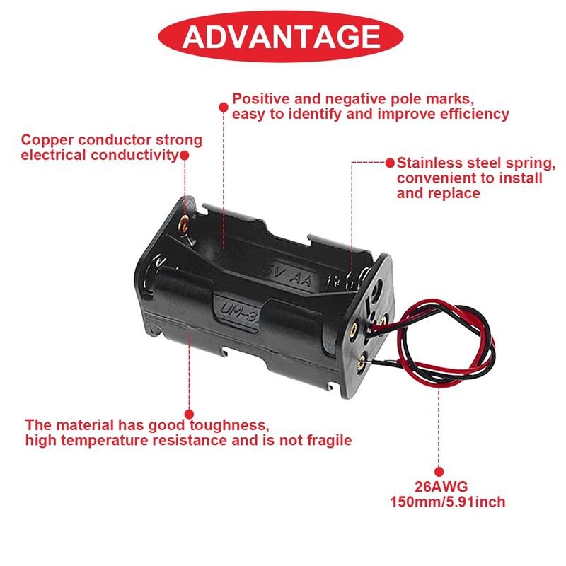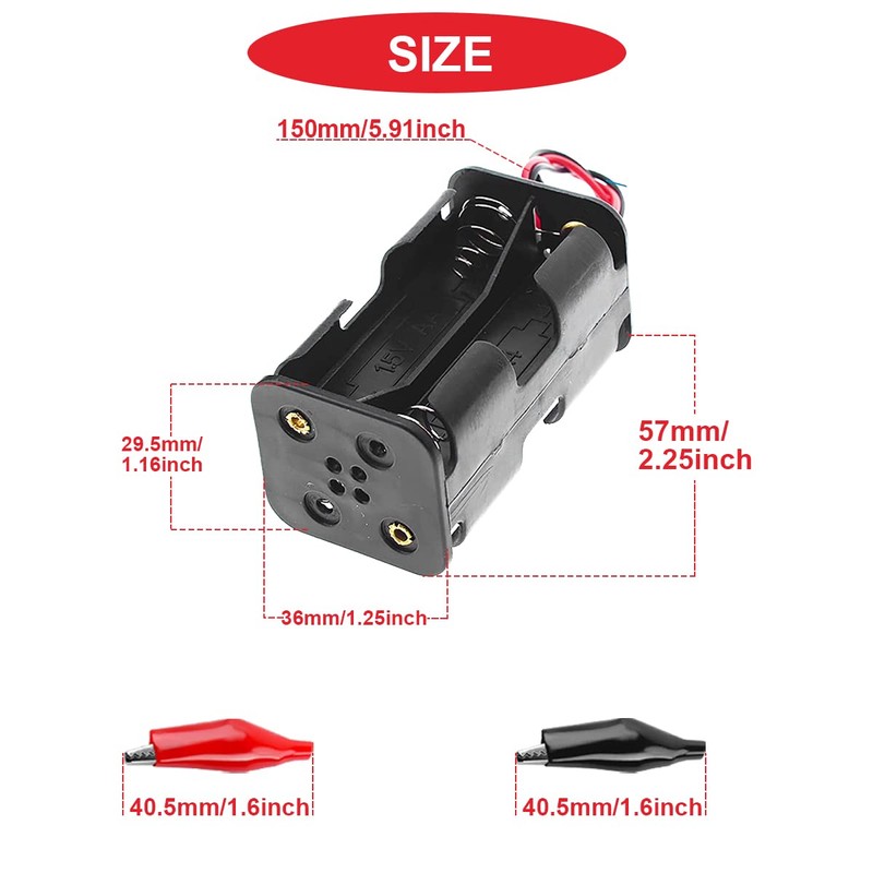 - đ˘ăSpecificationsăBattery Type: 4 x 1.5V AA batteries;Wire length: 5.91 inch / 150mm; Wire Gauge: 26 AWG; Cable color: Red and Black;Case Dimensions: 57x36x29.5mm / 2.25x1.25x1.16inch(L*W*H).