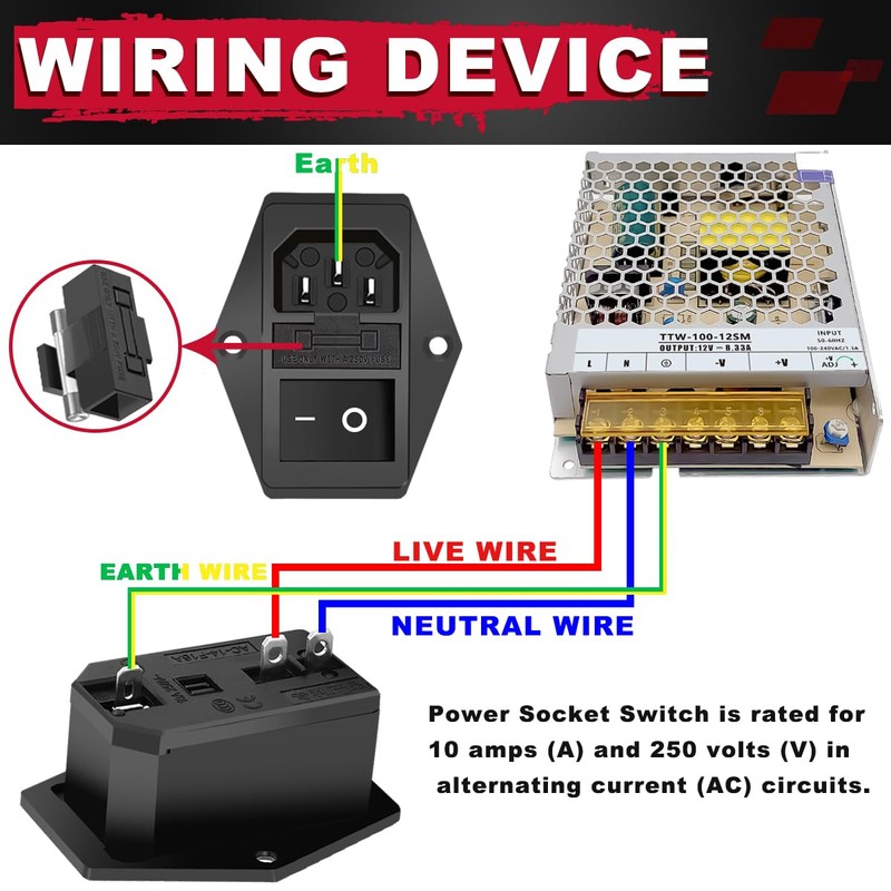 - 【10A 250V AC】Power Socket Switch is rated for 10 amps (A) and 250 volts (V) in alternating current (AC) circuits. This means the switch can safely operate up to these parameters.