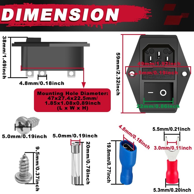 - 【Dimension】Power Socket Switch Total Size:59x49x38mm /2.32x1.92x1.49inch(L x W x H); Mounting Hole Diameter:47x27.4x22.5mm/1.85x1.08x0.89inch(L x W x H); Screw:5.0x9.5mm/0.19x0.37inch(W x H); Fuse:5x20mm/0.19x0.78inch(W x H); Fork Connector Color: Red 22-16 Gauge; Blue Terminals Inner diameter 4.8mm/0.18inch.