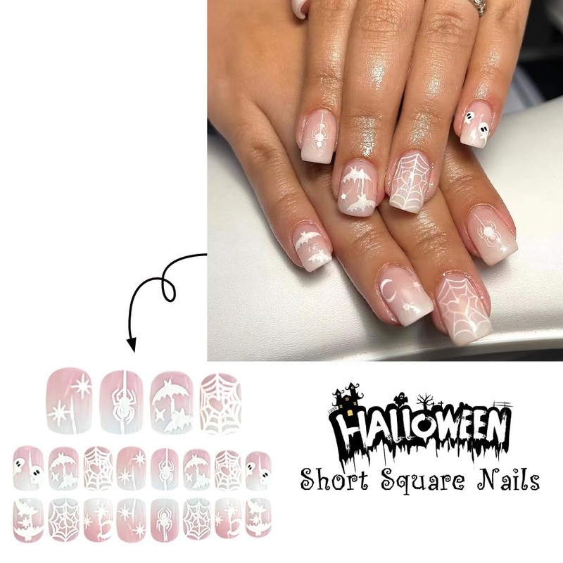 Mkwntg 24Pcs Halloween Press on Nails Short Square Fake Nails Cute White Spider Web Ghost Acrylic False Nails Star Moon Bat Glue on Nail Ombre French Tip Full Cover Glossy Stick on Nail for Women