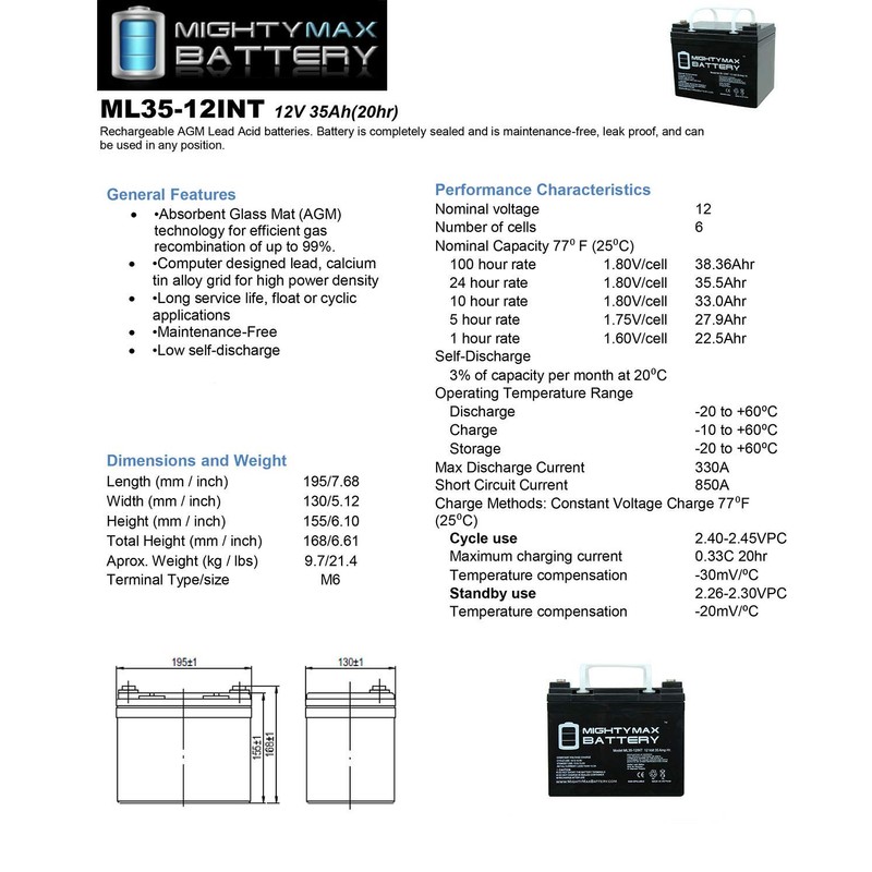 Delivering power when you need it the Mighty Max ML35-12 Internal Thread 12 Volt 35 AH uses a state of the art heavy-duty calcium-alloy grid that provides exceptional performance and service life in both float and cyclic applications