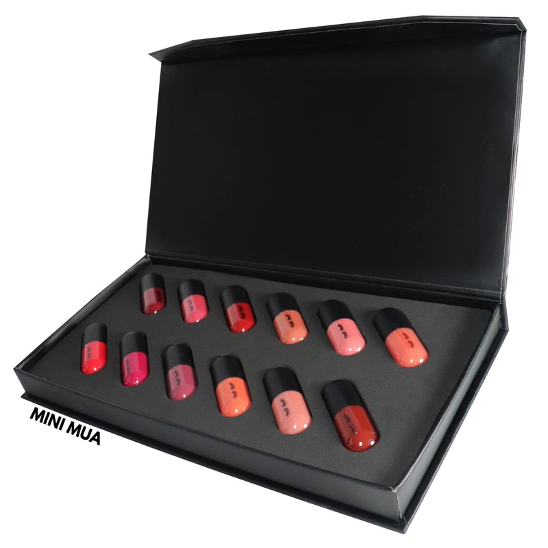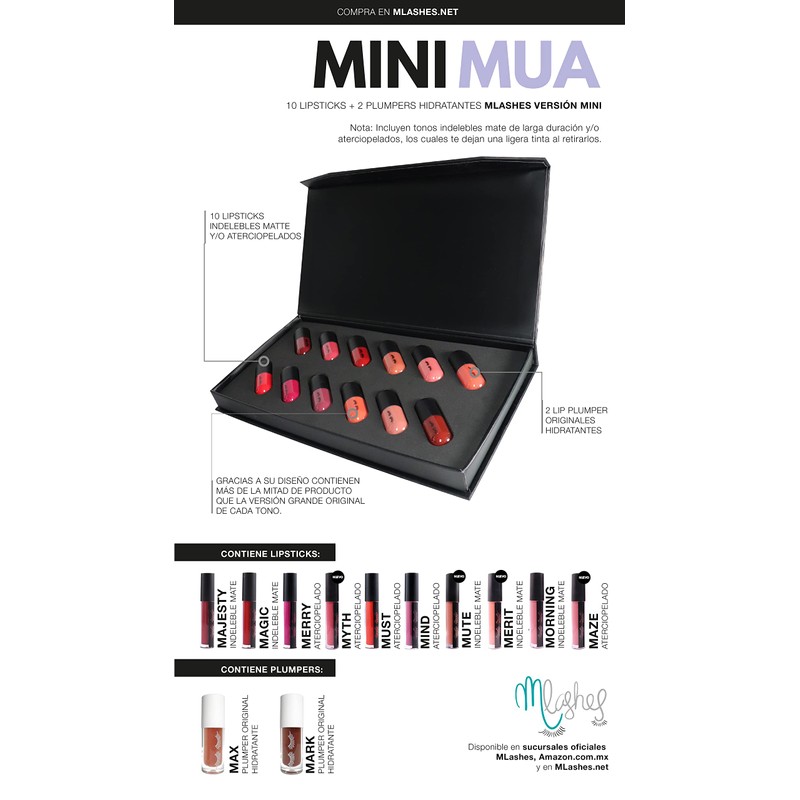 - Incluyen 10 tonos de lipsticks MLashes indelebles mate y aterciopelados y 2 lip plumpers hidratantes originales Max y Mark: