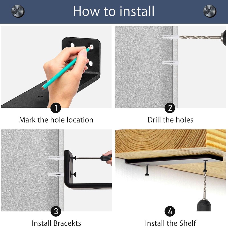 - 【Easy Installation】: No special skills are required to mount these open floating shelf brackets on the wall. The package includes all screws for you to install these shelf brackets to cement wall, wooden wall or plaster wall.