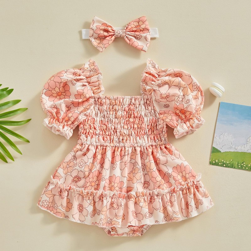Baby girl romper dress with fruit/flower print, square neck, ruched design, ruffled hemline, puffy short sleeves, baby girl summer romper, and cute headband set, simple but fashionable, make your baby so cute.