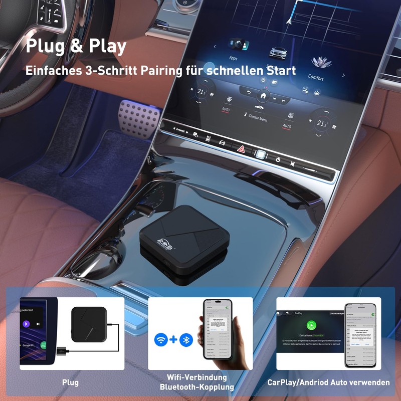 - Plug and Play: Just three simple steps: connect your car, connect to Wi-Fi, pair it with Bluetooth, and you can use the magic of the wireless CarPlay/Android car adapter. The wireless CarPlay/Android car adapter can be set up in minutes without the need for additional apps or drivers. After the first connection, our adapter will automatically reconnect when you start your car.