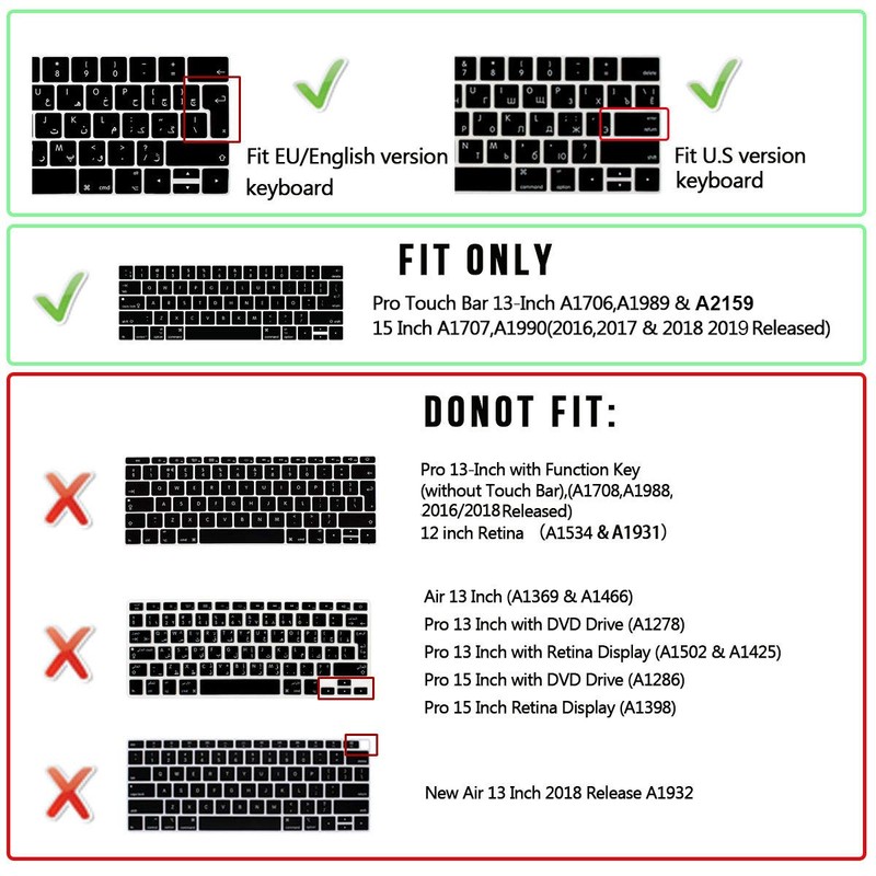 - Perfect fit for Latest 2019 2018 2017 2016 New Pro 13-inch A2159 A1989 A1706 with TouchBar & New Pro 15-inch A1990 A1707 with Touch Bar.