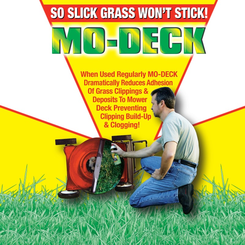 When used regularly, Mo-Deck Non-stick Spray for Mowers dramatically reduces adhesion of grass clippings and deposits to the mower deck. This prevents clipping build-up and clogging. Mo-Deck: so slick, the grass won't stick. Simple to apply, shake and spray, convenient for larger deck areas Ready to use in less than 10 minutes after spraying Engineered with modern polymer technology Creates a slick, non-stick surface, ideal for build-up areas Reduces mechanical wear and can extend operating life of products Will not attract or hold dirt or dust Molecularly bonds to metal or plastic surfaces Saves time and money Proudly made in the USA, in use for over 10 years!