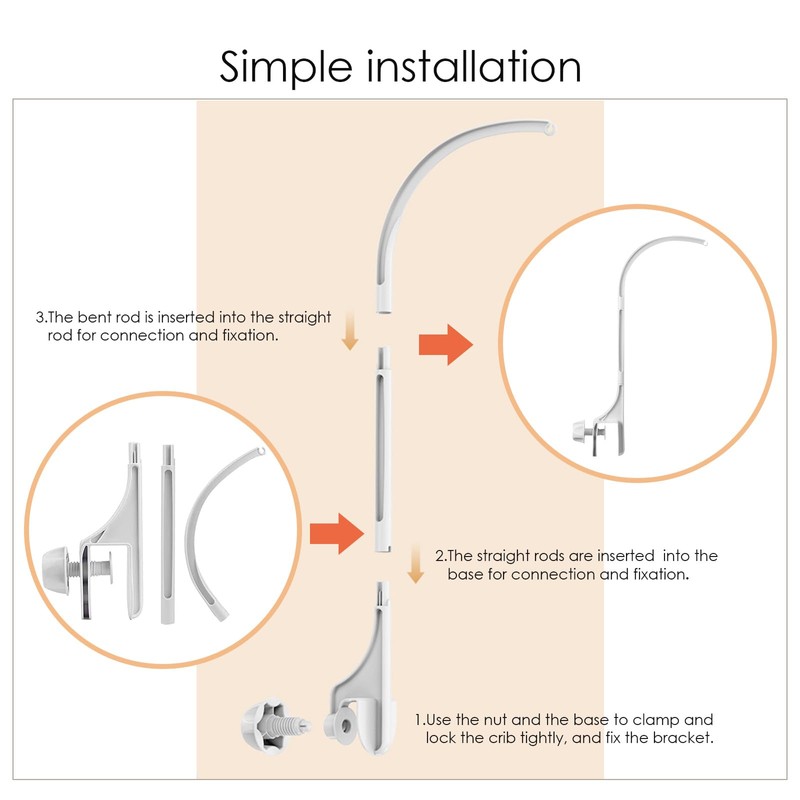- Stylish Design The bracket rack rod and smooth surface without sharp edges blends seamlessly into any nursery decoration. At the same time, it provides a soothing atmosphere for your baby. The mobile holder is a versatile solution for use in baby bed, changing table.
