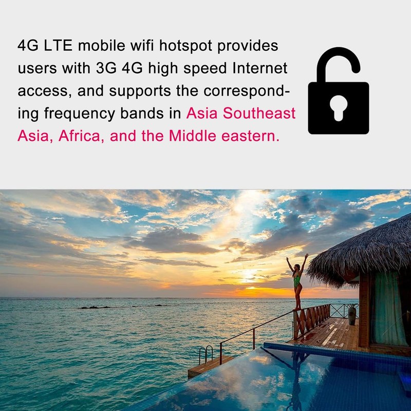 - SUPPORT 3G 4G: 4G LTE mobile wifi hotspot provides users with 3G 4G high speed Internet access, and supports the corresponding frequency bands in Asia Southeast Asia, Africa, and the Middle eastern.
