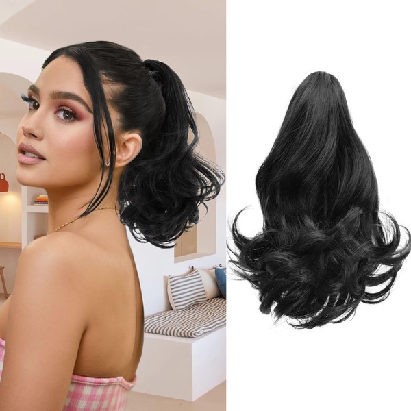 MOCA HAIR Ponytail Extension,Black 12 Inch Claw Clip Ponytail Extension, Soft Wavy Curly Clip on Ponytails for Women Heat Resistant Synthetic Hairpiece for Daily Use
