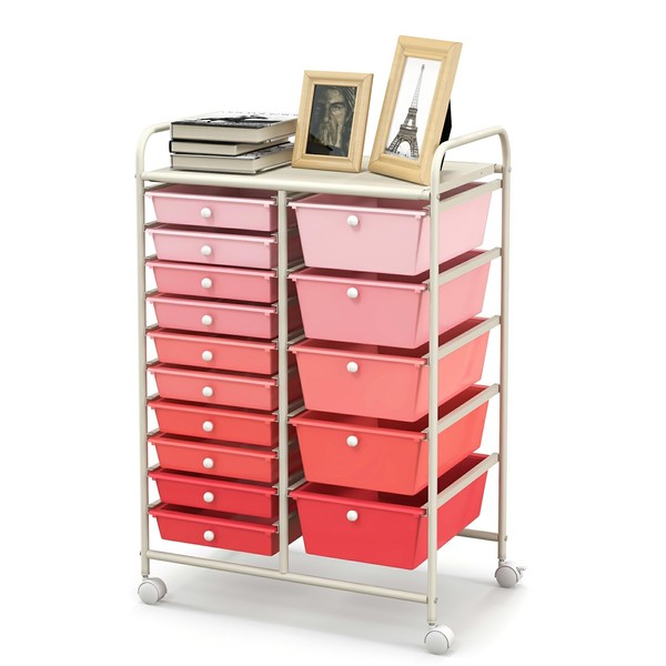 Moccha 15-Drawer Rolling Storage Cart - Under Desk Storage Drawers with wheels for Craft Art Supply Paper Salon, Scrapbook Paper Tools, Mobile Utility Cart for Classroom (15 Drawers, Gradient Pink)