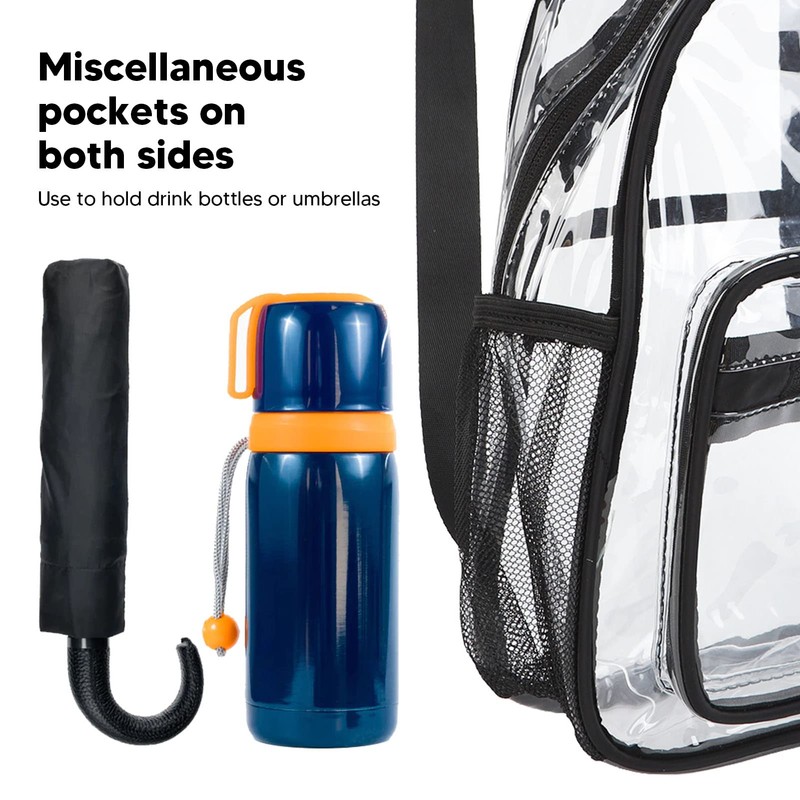 - DISEÑO DE APERTURA CON CREMALLERA: la mochila transparente de PVC está diseñada con una abertura con cremallera, lo que facilita ponerla y sacarla. Dos bolsillos laterales para comestibles para botellas de bebidas o sombrillas.
