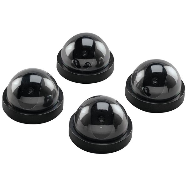 Theft deterrence is affordable with this set of Mock Surveillance Security Cameras. Potential intruders will think twice when they see the red lights on these motion-activated devices. The stationary fake cameras resemble real home security cameras with a flash of red light. With this set of 4, neighbors and visitors will think you have a complete home surveillance system. Each mock camera installs in minutes with no wiring required; 2 wall screws included. Each requires 2 AA batteries (not included). 4 1/2"L x 3"W.