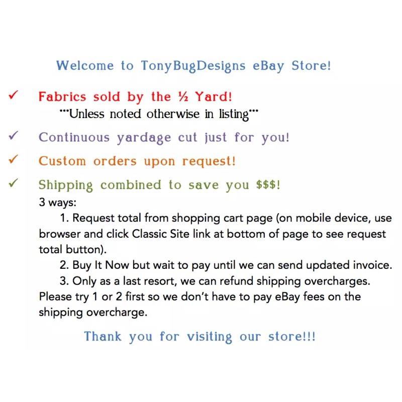 If you wish to make multiple purchases to save on shipping --- please place them in your shopping cart and then request total from seller so we can send you an invoice with the correct shipping.  Please remember that if you use the shopping cart, the items are not saved for you until you pay for them or commit to buy them.  We can ship up to 8 yards of fabric in a priority mail flat rate envelope, up to 16 yards in two flat rate envelopes, and up to 24 yards in a flat rate box.  Use the shipping/payment tab to check shipping rates located under the photo.