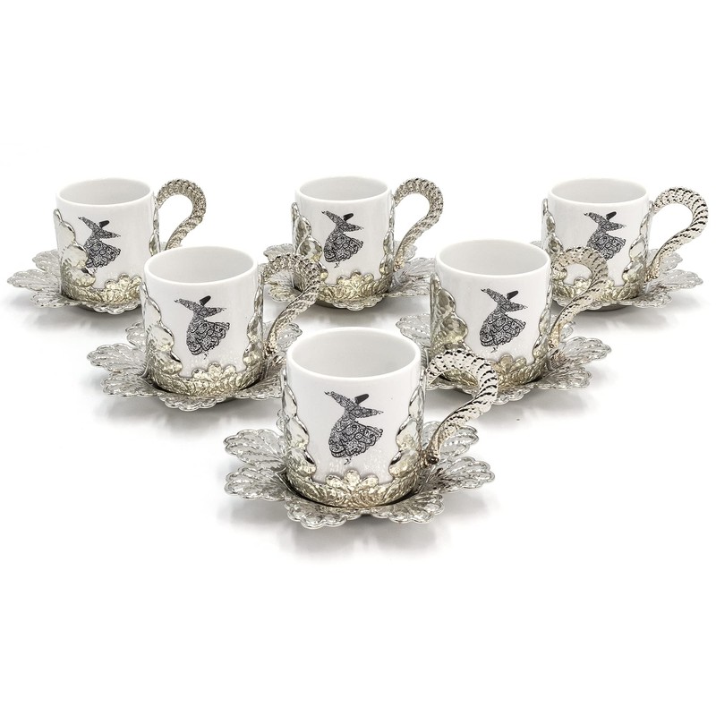 An incredible 6 piece coffee cup set, perfect for when hosting guests or a beautiful gift for any special occasion. Features unique illustrations of a whirling dervish on each porcelain cup, as well as cool Ottoman inspired metal holders and saucers! It's a one of a kind coffee cup set that will make a great addition to any home!