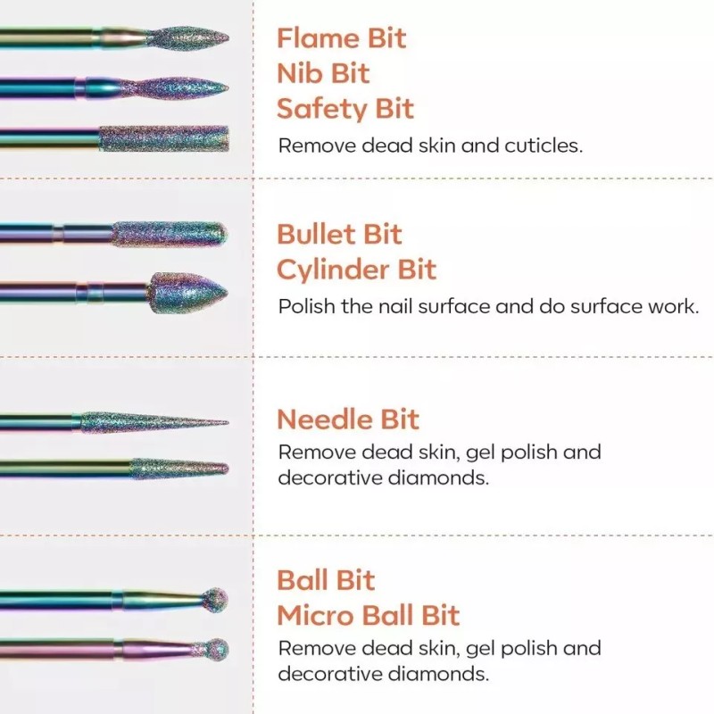 - Usage: The drill bits nail tech set with different shapes to meet all your needs, such as buffering, grinding, sharpening, sanding, polishing acrylic and gel nails, and removing cuticles, extension gels, dead skin, and any other nail care needs.