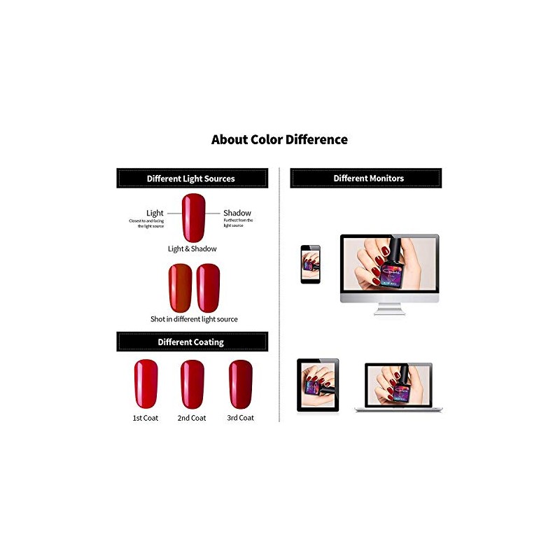 Direction: Step 1: Prep and push back cuticles. Step 2: Apply Base coat, and cure under UV lamp for 1 minute, LED light for 30 seconds. Step 3: Apply color gel polish in a thin application. Cure under UV lamp for 2 minutes, LED light for 30-60 seconds. Step 4: Apply a second coat, then cure under UV lamp for 2 minutes, LED light for 30-60 seconds. Apply the third coat if neccessary. Step 5: Apply No Wipe Top coat and cure under UV lamp for 2 minutes, LED light for 30-60 seconds. Step 6: Enjoy your 14 Day Manicure! How to remove: Step 1: Soak cotton pad with acetone. Step 2: Wrap around each nail with tin foil leave for approx. 10 minutes, check if ready if not leave a few minutes more. Step 3: Use an orange stick or a cuticle pushier to remove softened gel.